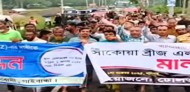 পলাশবাড়ীর সাঁকোয়ায় ঊচত প্রতিষ্ঠার দাবিতে মানববন্ধন