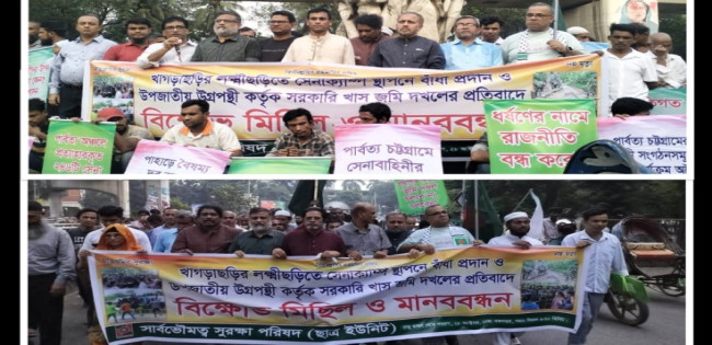 খাগড়াছড়ির লক্ষ্মীছড়িতে সেনা ক্যাম্প স্থাপনে বাঁধা প্রদান ও উপজাতীয় উগ্রপন্থী কর্তৃক সরকারি খাস জমি দখলের প্রতিবাদে মানববন্ধন ও বিক্ষোভ মিছিল