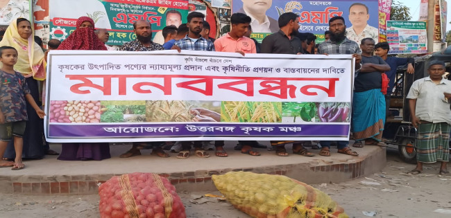 বিরামপুরে আলু সড়কে ফেলে কৃষকদের মানববন্ধন