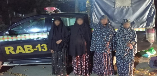 দিনাজপুরে শরীরে বিশেষ কায়দায় ফেনসিডিল বহন: র্যাব–১৩ এর অভিযানে ৪ নারী মাদক ব্যবসায়ী গ্রেফতার