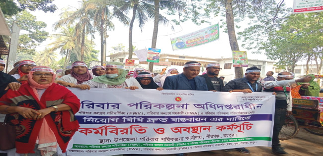 পীরগঞ্জে পরিবার পরিকল্পনা অধিদপ্তরের মাঠপর্যায়ের কর্মীদের কর্মবিরতি ও শান্তিপূর্ণ অবস্থান কর্মসূচি পালন